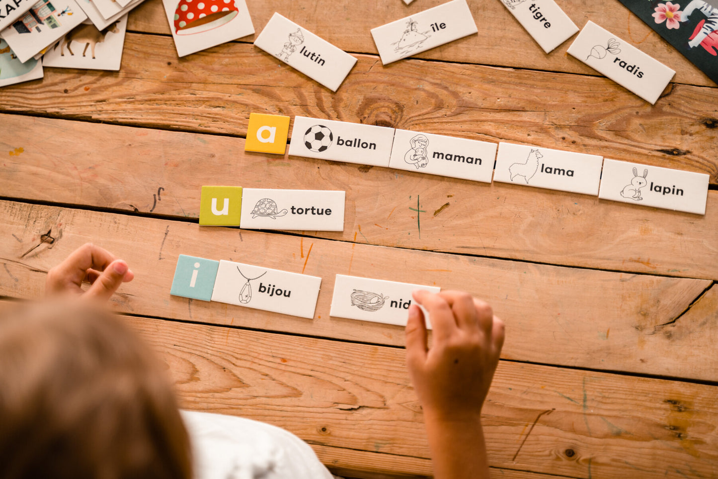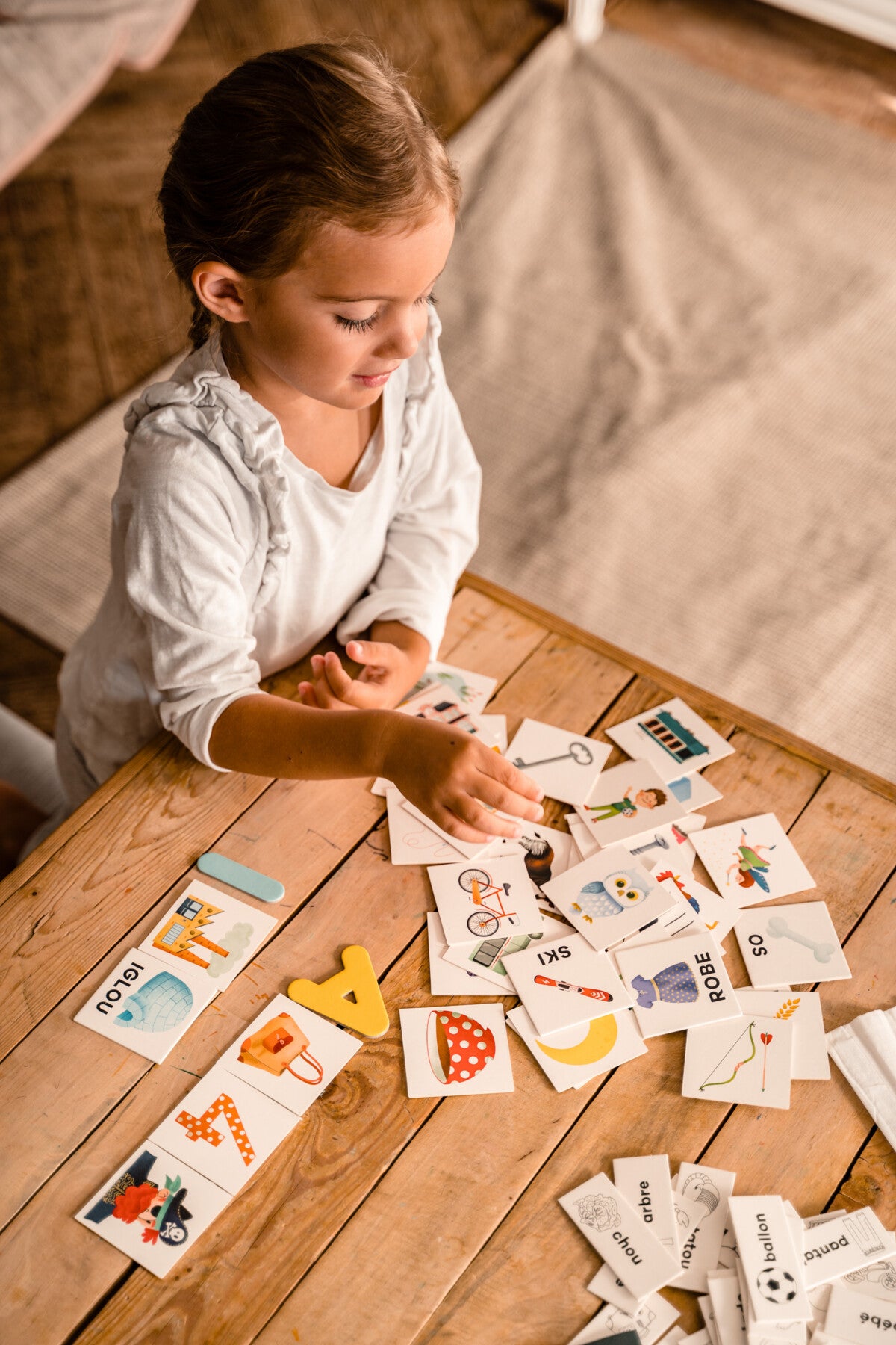 MANIPULER, COMBINER, DECHIFFRER : avec l'ensemble du matériel et les jeux, pas à pas l'enfant découvre ses premiers mots puis des groupes de mots et enfin des phrases