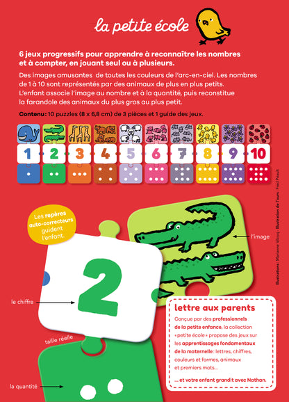 Permet d'associer un chiffre à une notion de quantité grâce au code couleur et offre aussi la possibilité d'ordonner les puzzles constitués par ordre croissant