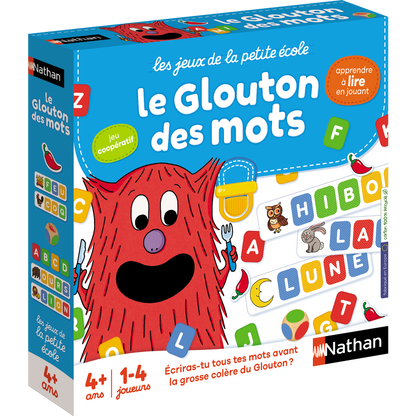 COMMENT JOUER ? On choisit 9 planches-mots tous ensemble. A tour de rôle, on lance le dé, si c’est une couleur qui apparaît l’enfant doit trouver une lettre de la bonne couleur à placer sur l’une des planches. Si c’est une étoile, quelle chance ! Il peut choisir la lettre qu’il souhaite pour compléter l’un des mots. Attention, si c’est un piment il faut le mettre dans la bouche du Glouton. Dans ce jeu coopératif, on remporte la partie si le Glouton a englouti les 9 mots ! S’il a mangé 8 piments, fuyez-vite le Glouton a remporté la partie !