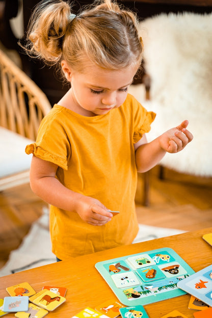 Un grand loto pour parcourir le monde avec les animaux à travers les 5 planches illustrées et 30 jetons.Chaque enfant choisit une ou plusieurs planches. Les images sont mélangées et empilées face cachée. Les enfants piochent à tour de rôle : le premier qui a complété sa planche a gagné !