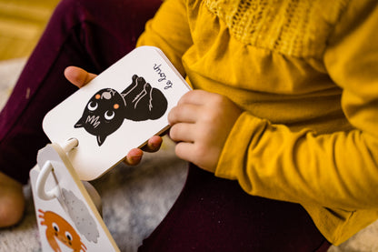 Un premier imagier que le bébé attrape facilement grâce à l'anneau. Un objet par carte pour une reconaissance claire