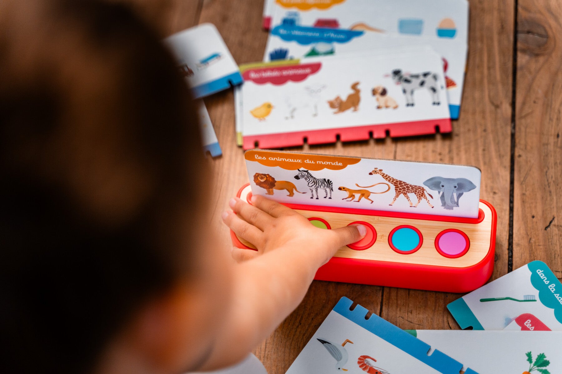 L’enfant choisit une planche, appuie sur un bouton pour écouter le mot : l’oiseau, cui-cui !