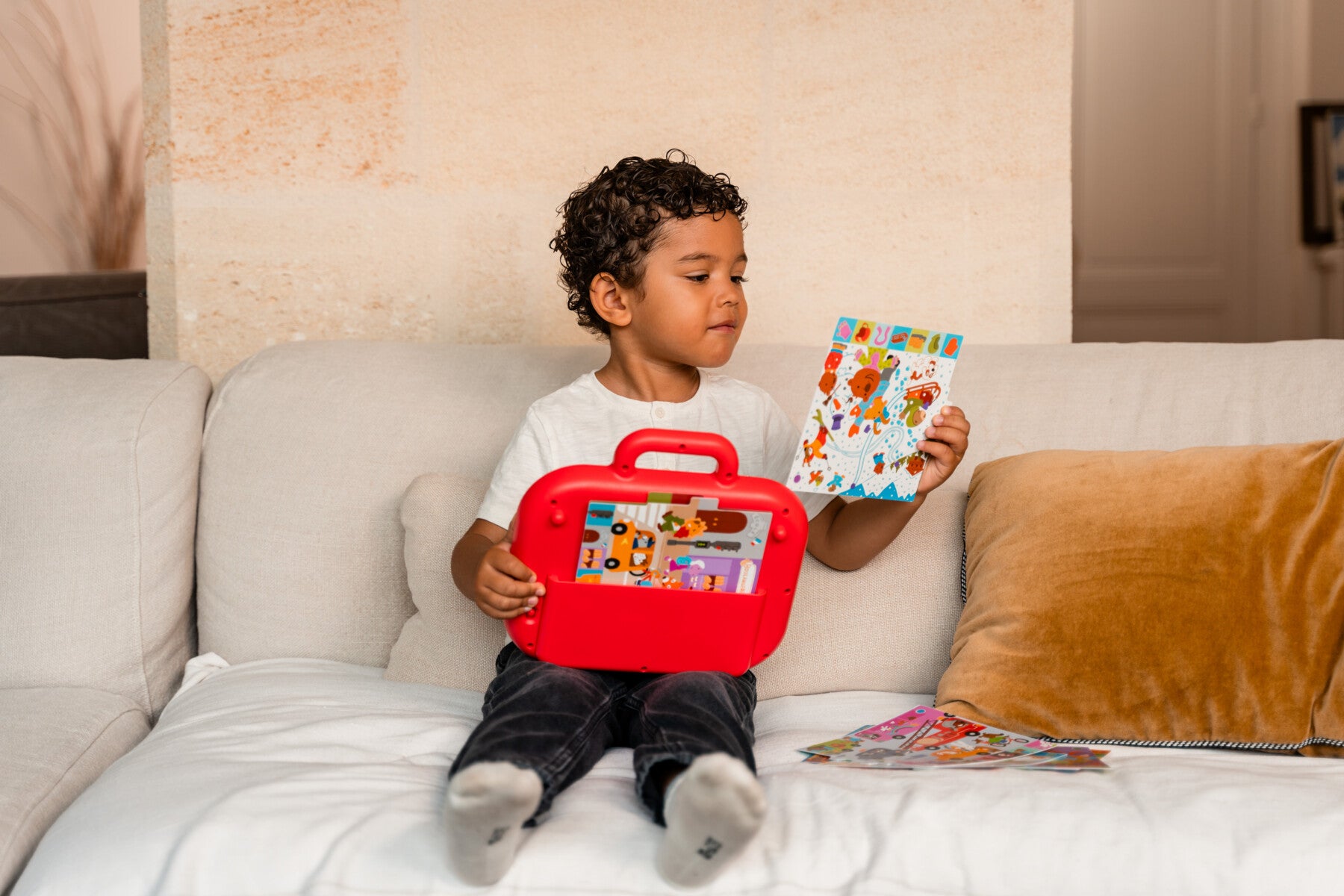 TRÈS PRATIQUE & COMPLET, grâce à son format tablette très apprécié des enfants pour faire "comme les grands" et un emplacement spécial au dos pour ranger les planches. Doté de 2 niveaux sonores et d'un arrêt automatique