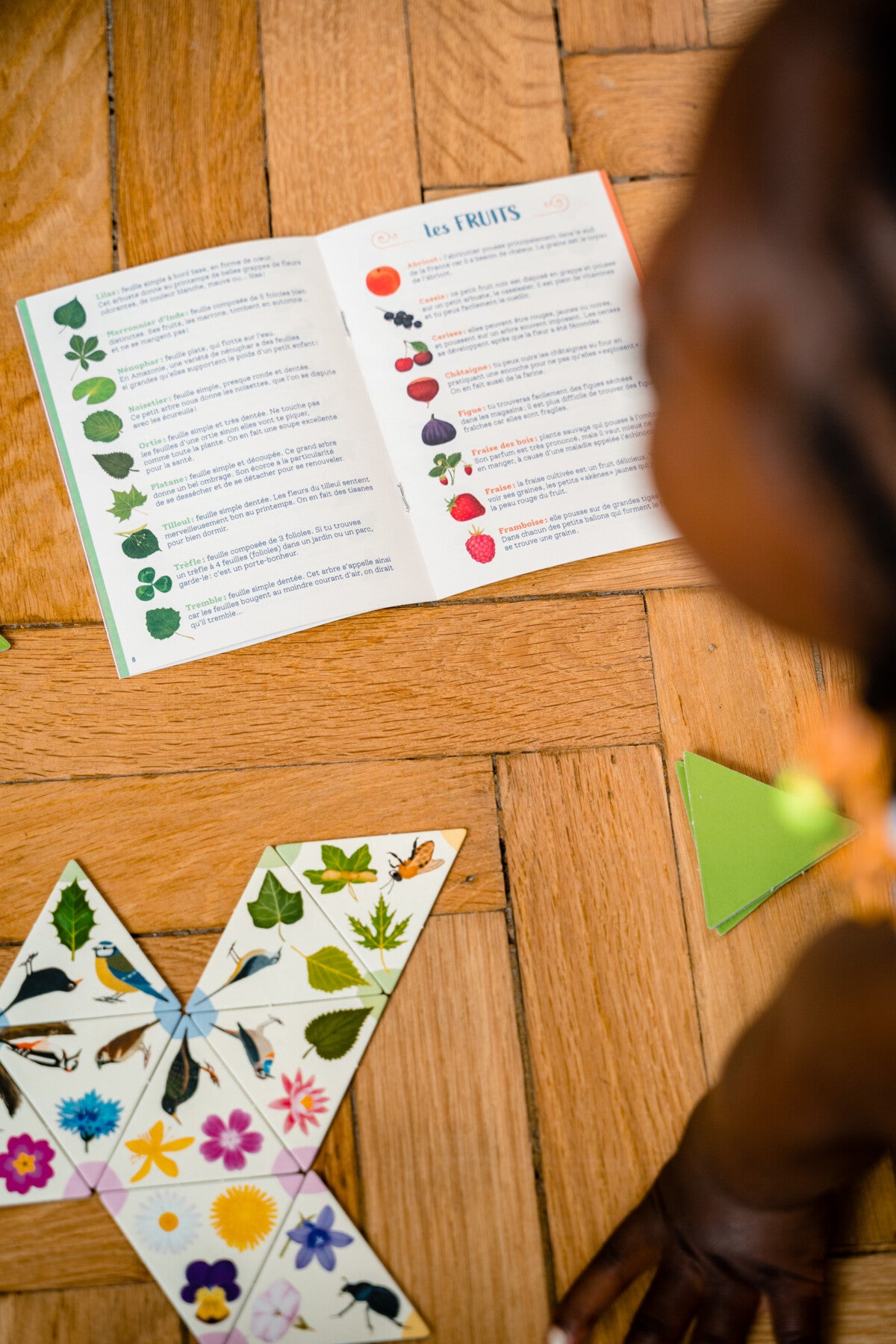 35 jetons triangulaires avec 3 images de fleurs, d'insectes, de feuilles, d'oiseaux ou de fruits.